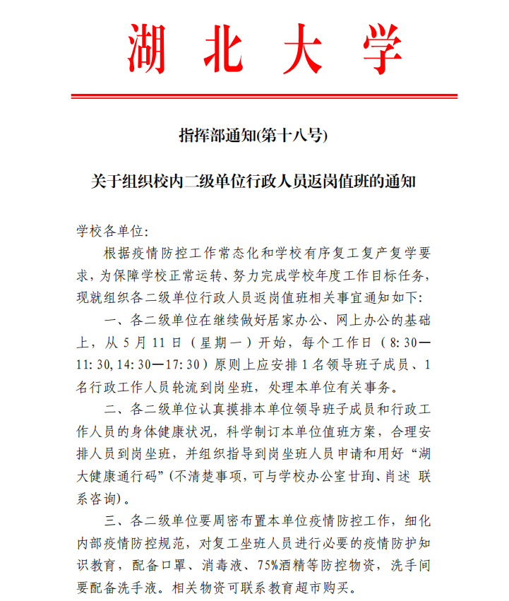 來源:湖北大學疫情防控指揮部 作者: 編輯:鮮文濤 時間:2020-05-08 字號: 【大】 【中】 【小】