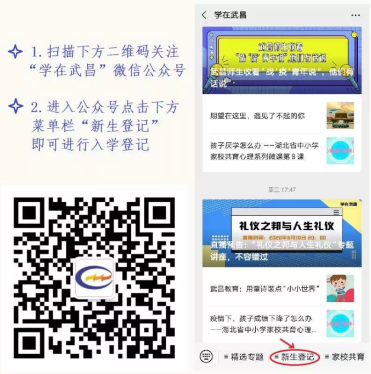 為方便各位家長辦理入學登記,“學在武昌”微信公眾號上設置了“新生登記”菜單欄,家長可以通過關注微信公眾號登記信息,具體操作如圖: