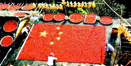 湖北日報訊 圖為:農(nóng)家大媽用辣椒等農(nóng)作物拼的國旗。(資料圖片)