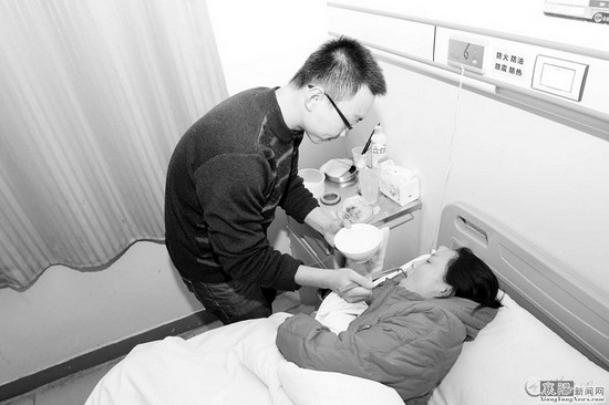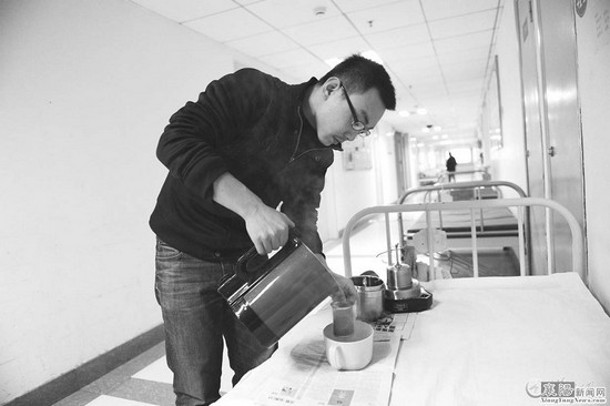 誰料禍不單行,父親被送進重癥監(jiān)護室不久,整日以淚洗面的母親又因常年的肝病復(fù)發(fā),躺倒在同一家醫(yī)院的病床上。家中年邁體弱的爺爺、奶奶一下慌了手腳,根本幫不上忙,家庭重擔全部壓在趙帥的肩膀上。一開始我很害怕,不知道該怎么辦。但當時的情況不允許我多想,我只能咬牙硬著頭皮沖上去。趙帥說,雖在同一家醫(yī)院住院,但父母的病房大樓相隔一條街。每天早上,在醫(yī)院食堂囫圇吞下兩個饅頭或是一碗面條,他就要給母親買粥熱飯;照顧母親吃完,他又將大米、蘿卜、香蕉、蘋果等混合打成漿汁,送到父親的重癥監(jiān)護室外。之后,再奔走在醫(yī)院各個窗口,繳費、拿藥、咨詢病情。其實根本吃不下,但我每天還是逼著自己吃得飽飽的,只有這樣,才有力氣守著我爸媽。