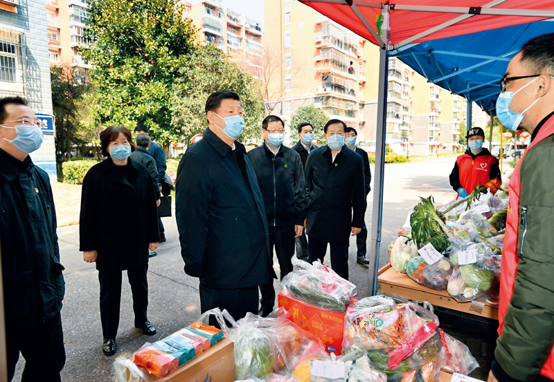 2020年3月10日,中共中央總書記、國家主席、中央軍委主席習近平專門赴湖北省武漢市考察新冠肺炎疫情防控工作。這是習近平在東湖新城社區生活物資集中配送點,詳細詢問社區群眾生活物資采購和供應情況。 新華社記者 謝環馳/攝