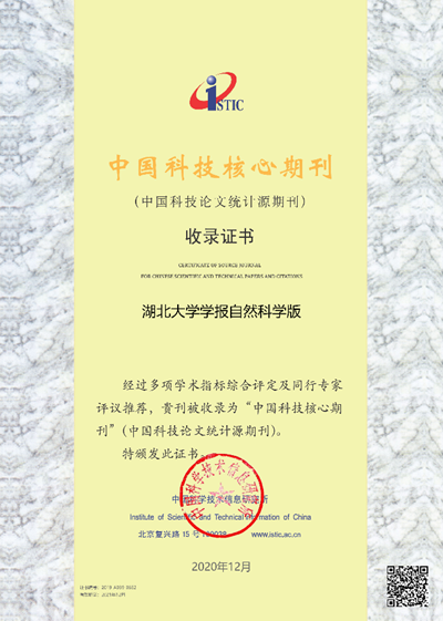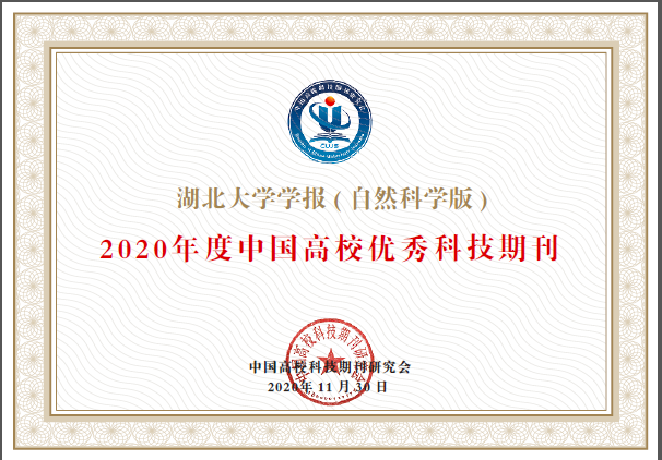 在中國高校科技期刊研究會評優活動中,《湖北大學學報》(自然科學版)獲得“2020年度中國高校優秀科技期刊”榮譽稱號。此外,《湖北大學學報》(自然科學版)同時入圍中國科學技術信息研究所發布的《2020年中國科技論文(核心)統計源期刊》(科技部委托的科技智庫分析系統之一)和2020版武漢大學RCCSE中國學術核心期刊(A等級)。