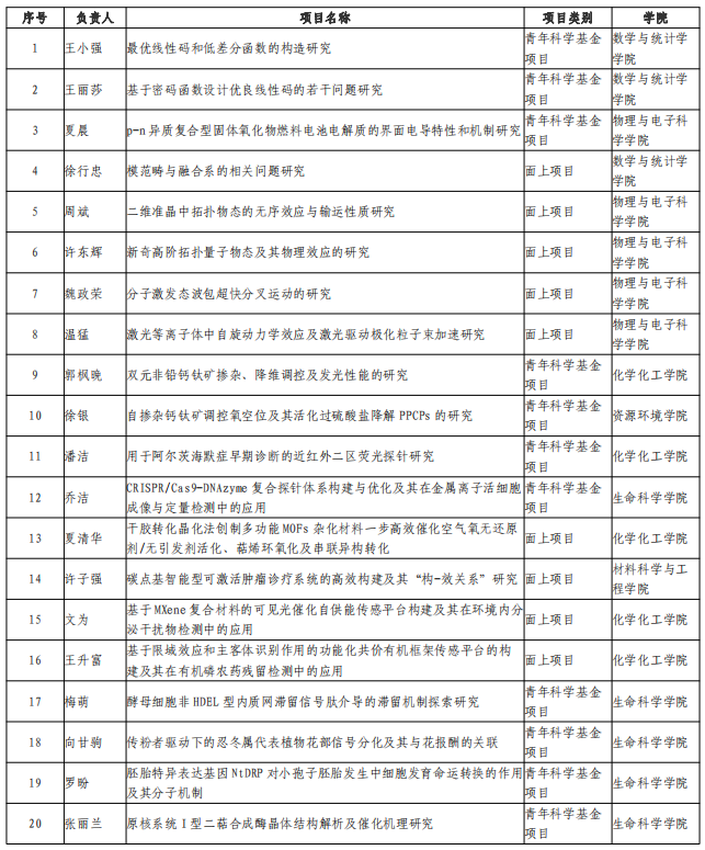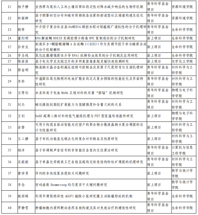 按項目類型,我校獲批面上項目18項、青年科學基金項目22項;按科學部,獲批項目分布在六個科學部,其中生命科學部11項、數理科學部8項、化學科學部8項、工程與材料科科學部7項、信息科學部4項、醫學科學部部2項;按學院,生命科學學院11項、材料科學與工程學院7項、物理與電子科學學院7項、化學化工學院6項、數學與統計學學院5項、資源環境學院3項、計算機與信息工程學院1項。