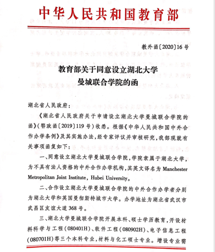 湖北大學與曼徹斯特城市大學的交流合作始于2015年,迄今已開展高層互訪、教師交流、聯合授課、合作研究、學生聯合培養等多種形式的合作交流活動,具有深厚的合作基礎。2015年12月,雙方達成聯合申辦“湖北大學曼城聯合學院”非獨立法人中外合作辦學機構的意向。在兩校高層領導及學科專家前期充分溝通、論證的基礎上,兩校于2019年9月簽署聯合辦學協議,并按照申報流程逐級向湖北省教育廳、教育部提交申報材料。2019年12月18日,根據教育部國際司的工作安排,兩校高層領導聯合代表團赴京參加了集中評議答辯。2020年4月26日,教育部正式發函批準設立“湖北大學曼城聯合學院”。兩校后續將進一步加強溝通,積極融合雙方優質教育資源,主動創新人才培養模式,全力提高學科建設水平,努力打造國際化師資團隊,使學院成為湖北大學國際化辦學的標桿和示范。