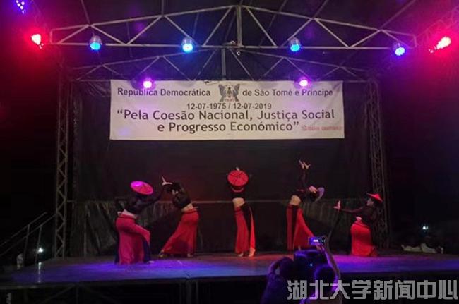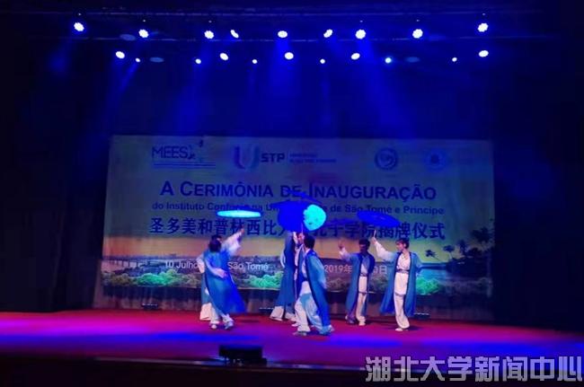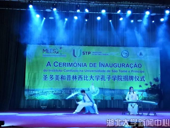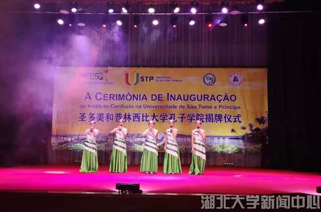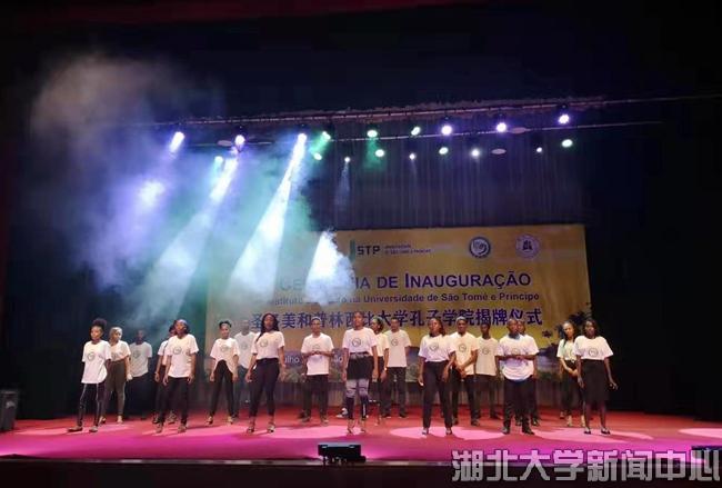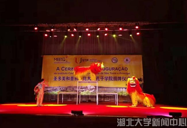 當地時間7月10日,湖北大學在非洲首家孔子學院揭牌儀式在圣普議會大廈隆重舉行,湖北大學龍獅藝術團精彩獻藝。圣普總理熱蘇斯,中國駐圣普大使王衛,湖北大學校長謝紅星,圣普大學校長科斯塔,圣普政府高級官員,中國援圣普代表、中資機構代表,相關駐圣普外交人員、主要媒體,湖北大學師生及圣普大學師生共900余人觀看演出。